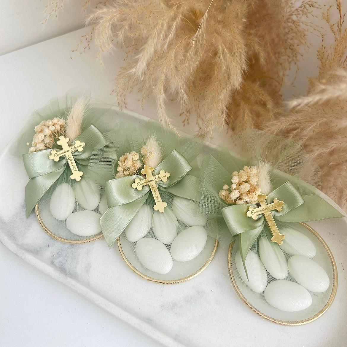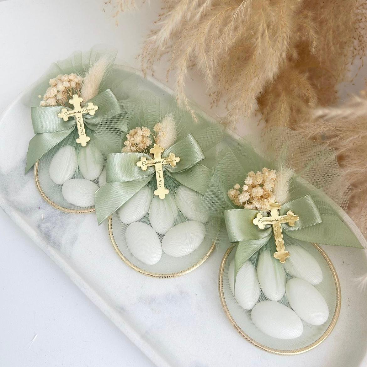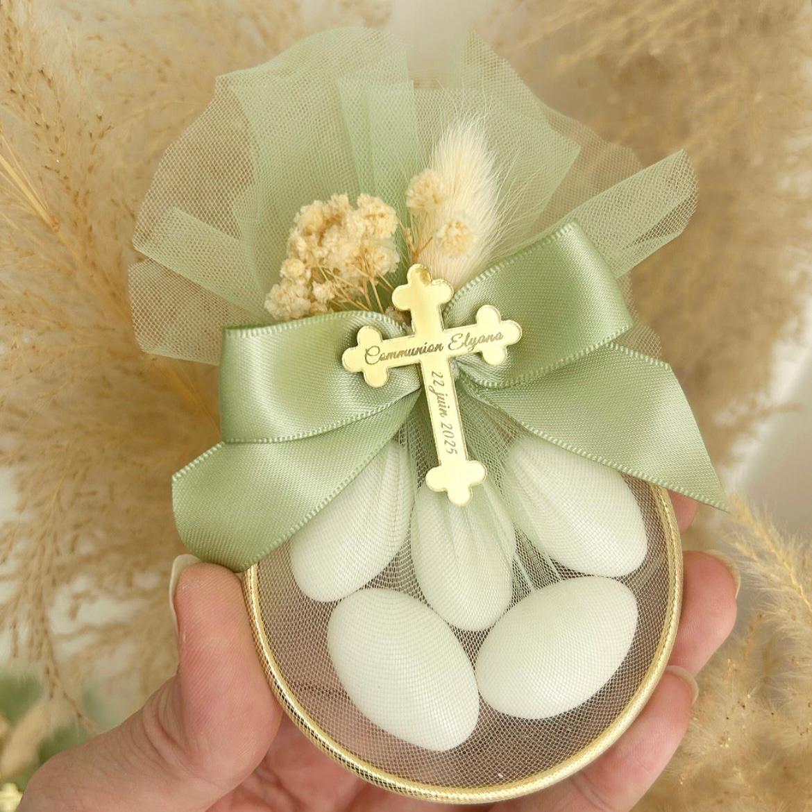 - Gravure personnalisée sur plexiglass doré en forme de croix, pour une touche spirituelle et sophistiquée.